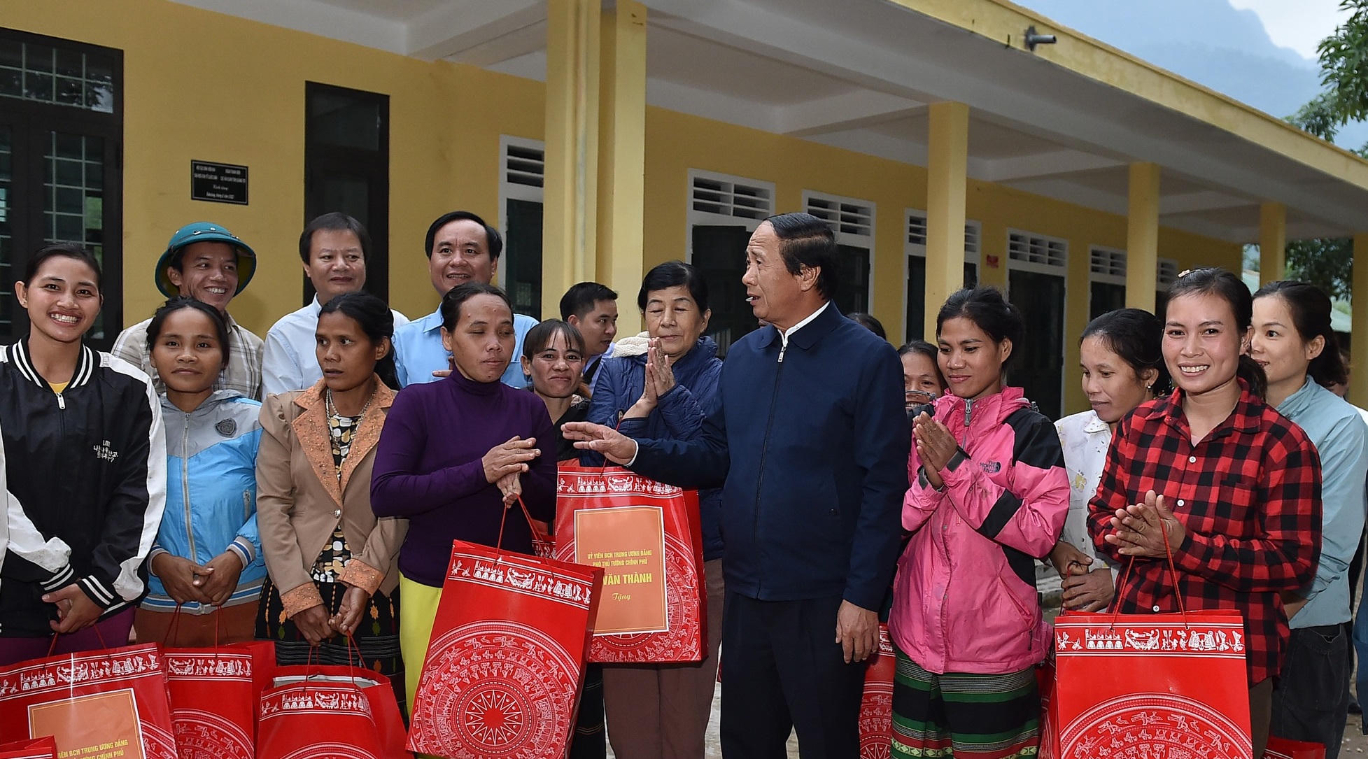 Phó Thủ tướng Chính phủ Lê Văn Thành và lãnh đạo tỉnh thăm hỏi, động viên người dân tại xã A Ngo, huyện Đakrông. |