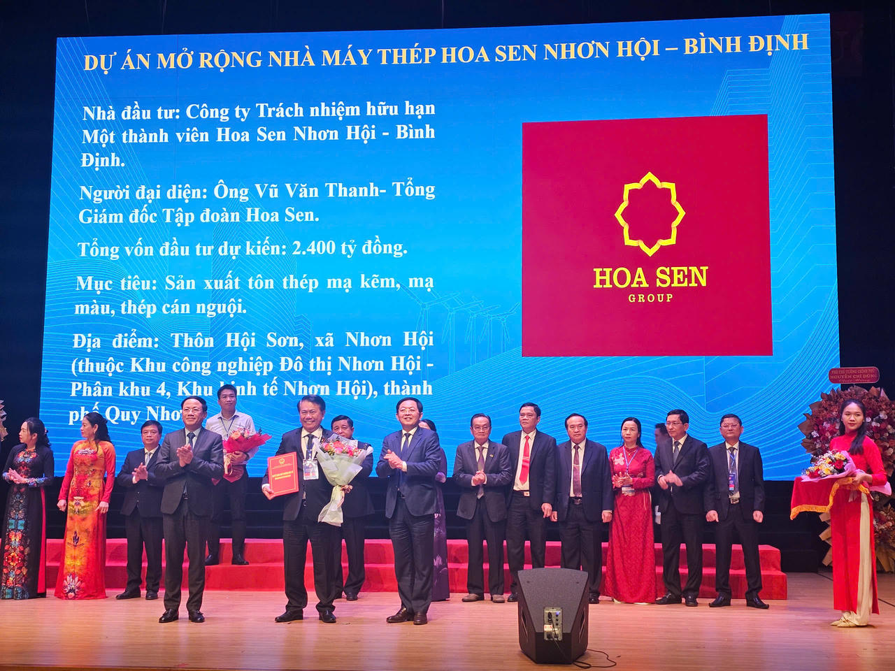 Lãnh đạo tỉnh Bình Định trao quyết định chủ trương đầu tư dự án Mở rộng nhà máy Hoa Sen Nhơn Hội - Bình Định, tại Khu kinh tế (KKT) Nhơn Hội, vốn đầu tư 2.400 tỷ đồng. |