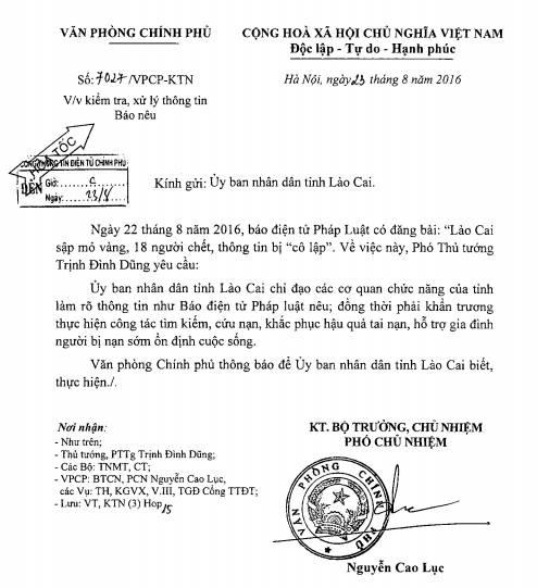 (PLO) - Phó Thủ tướng Trịnh Đình Dũng yêu cầu UBND tỉnh Lào Cai chỉ đạo các cơ quan chức năng của tỉnh làm rõ thông tin "Lào Cai sập mỏ vàng, 18 người chết, thông tin bị “cô lập”" được đăng tải trên báo Pháp luật Việt Nam điện tử.