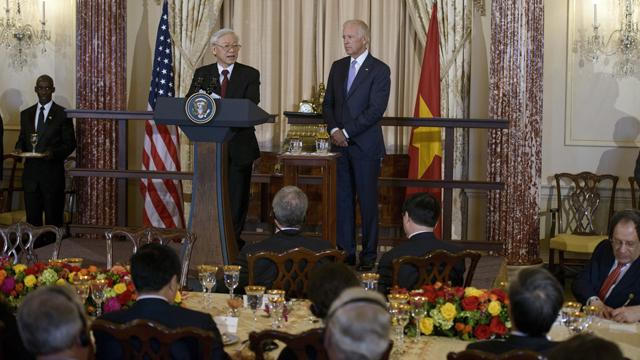 Sau cuộc gặp với Tổng thống Obama ở Nhà Trắng, Tổng bí thư Nguyễn Phú Trọng đã dự tiệc chiêu đãi do Phó tổng thống Joe Biden chủ trì tại Bộ Ngoại giao nhân chuyến thăm chính thức Hoa Kỳ.