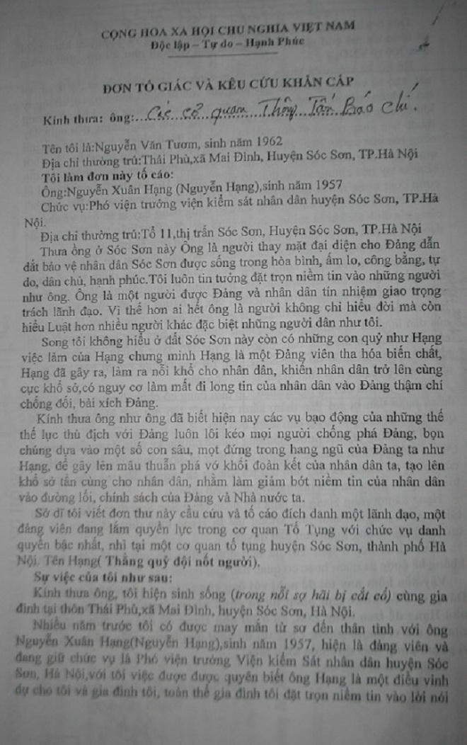 Báo Pháp luật và Thời đại mới nhận được đơn thư của công dân tố cáo hành vi chiếm đoạt tài sản của ông Nguyễn Xuân Hạng (SN 1957, hiện là Phó Viện trưởng Viện kiểm sát nhân dân huyện Sóc Sơn, Hà Nội). Chỉ riêng số tiền mà ông Hạng chiếm đoạt của ông Nguyễn Văn Tươm, sinh năm 1962, trú tại xã Mai Đình, huyện Sóc Sơn (Hà Nội) là 2 tỷ đồng.