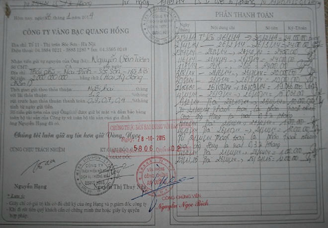 Theo như tìm hiểu, có rất nhiều người cũng vì tin tưởng ông Hạng nên đã gửi tiền vào Công ty TNHH Dịch vụ Thương mại Quang Hồng như trường hợp của Bà Lê Thị Thiện (SN 1959), thường trú tại Tổ 1, thị trấn Sóc Sơn với tổng số tiền gửi là 420 triệu đồng.
