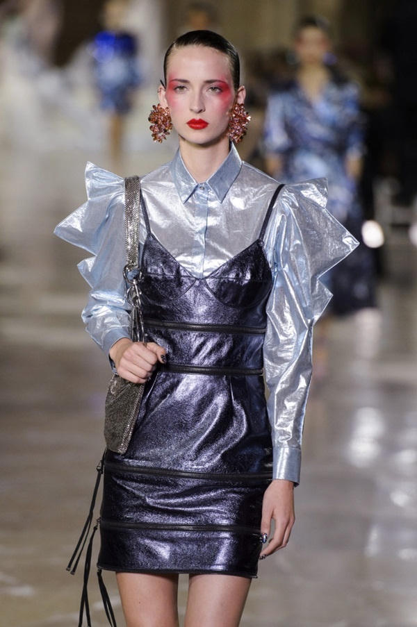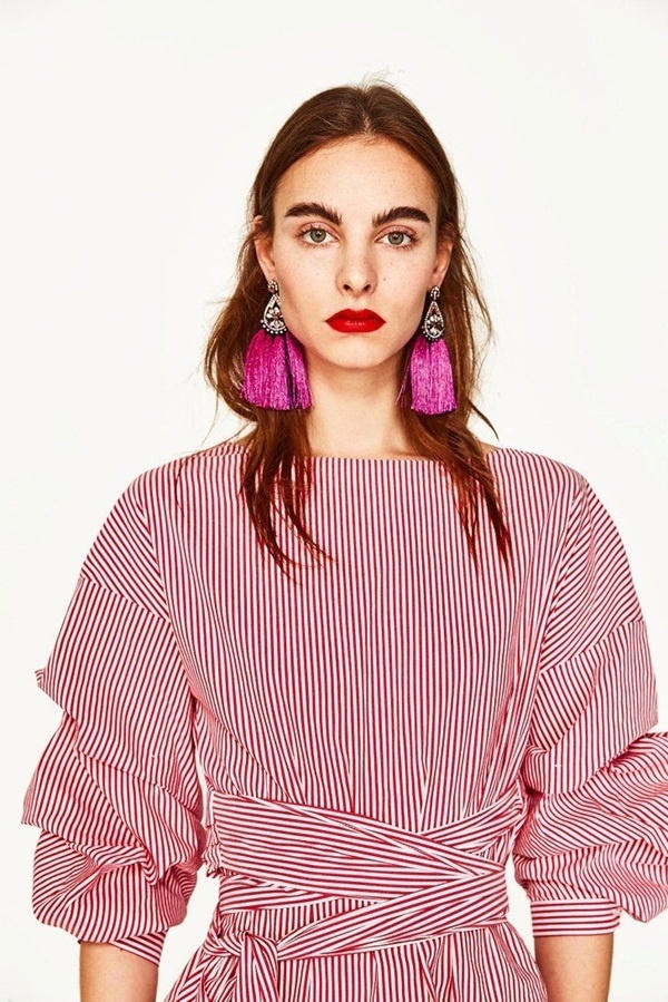 Tuy nhiên, khi chọn hoa tai, thay vì áp dụng quy tắc chọn những món đồ nhỏ gọn, bạn nên dùng hoa tai bản lớn. Khuyên tai lớn và áo nhấn vào ống tay tạo nên một cặp bài trùng ăn ý của phong cách thập niên 1980. Một chiếc hoa tai bé ở trường hợp này hoàn toàn không tôn gương mặt, vì sự chú ý đang dồn về tay áo.
