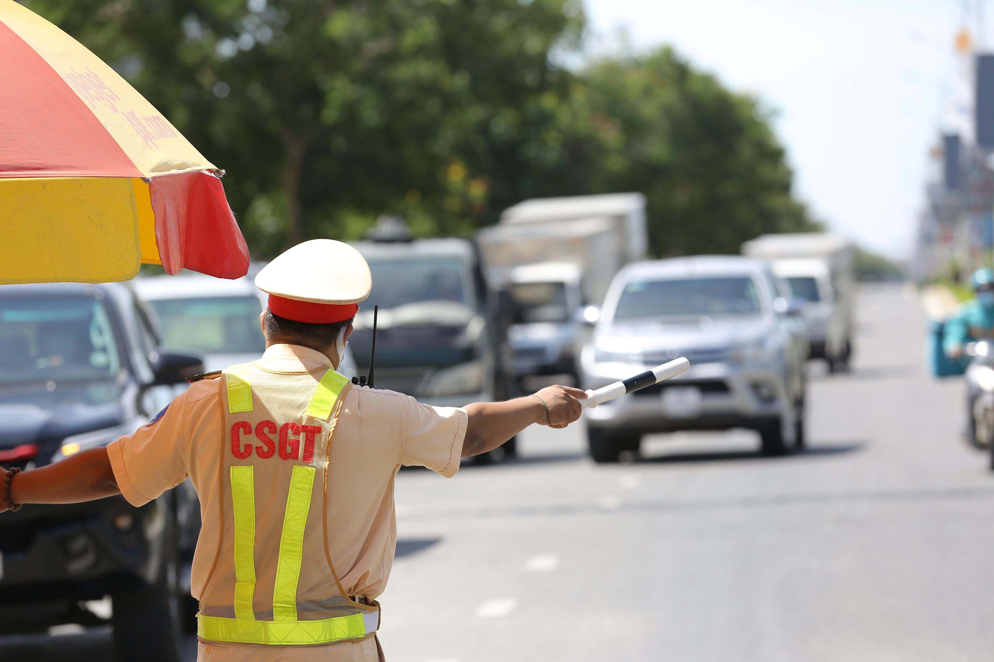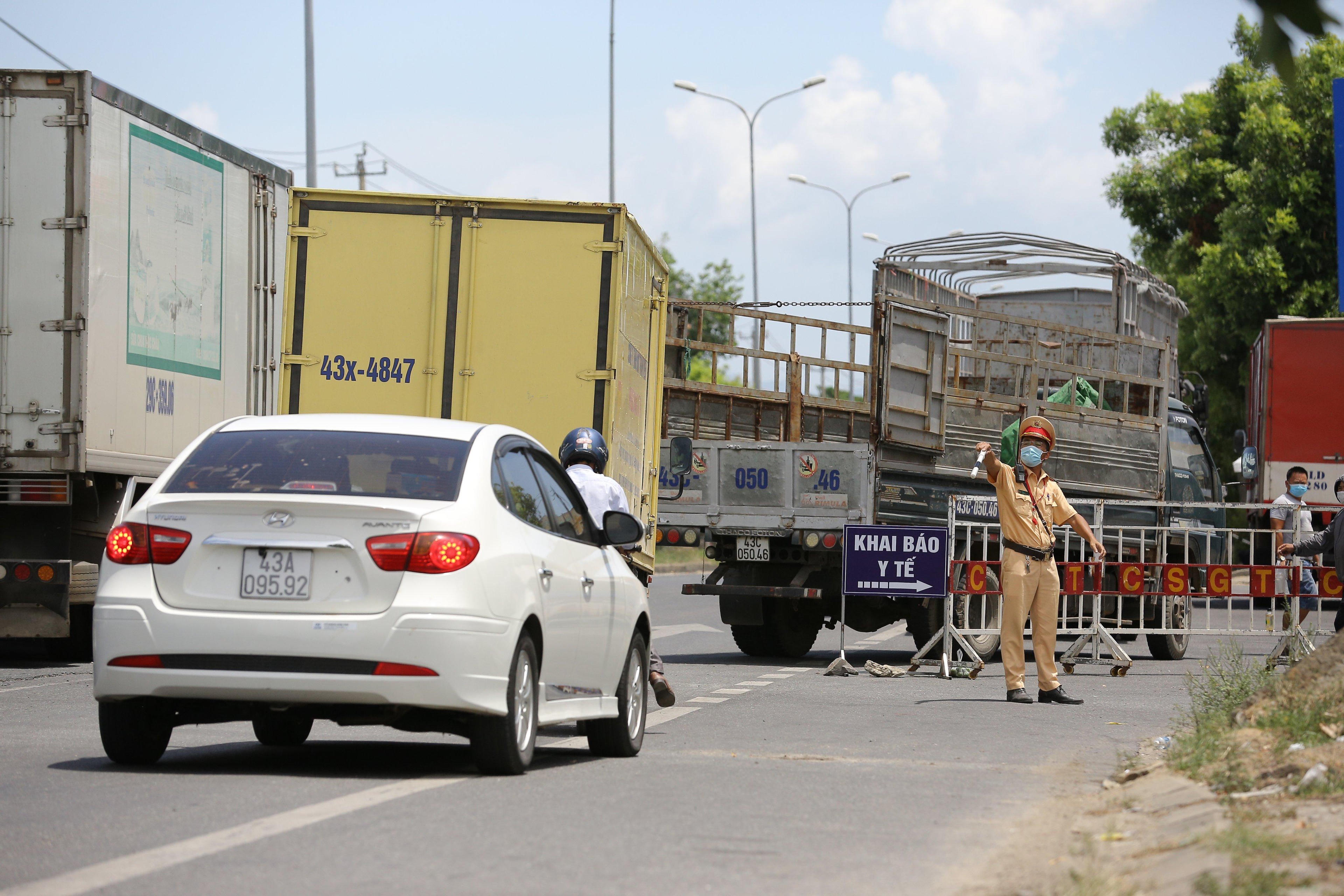 Ngày 22/6, tại chốt kiểm soát cửa ngõ vào TP trên Quốc lộ 1 ùn tắc cục bộ dù nắng nóng để tài xế chờ khai báo y tế khi đi qua Đà Nẵng.