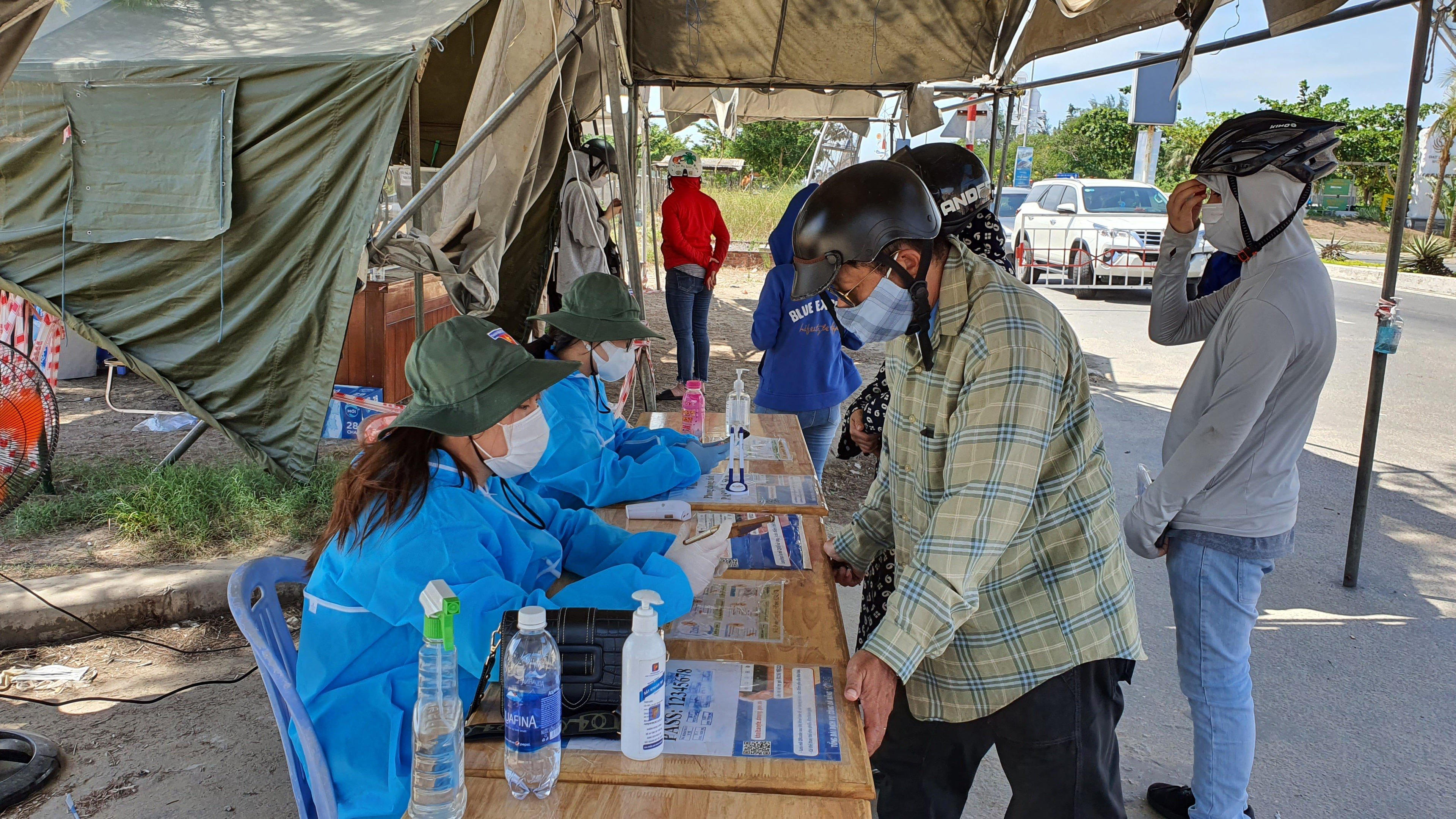 Sau khi tới điểm chốt kiểm soát dịch COVID-19, người dân và các tài xế dừng xe theo hướng dẫn của lực lượng CSGT và vào khu vực đo thân nhiệt, khai báo y tế...