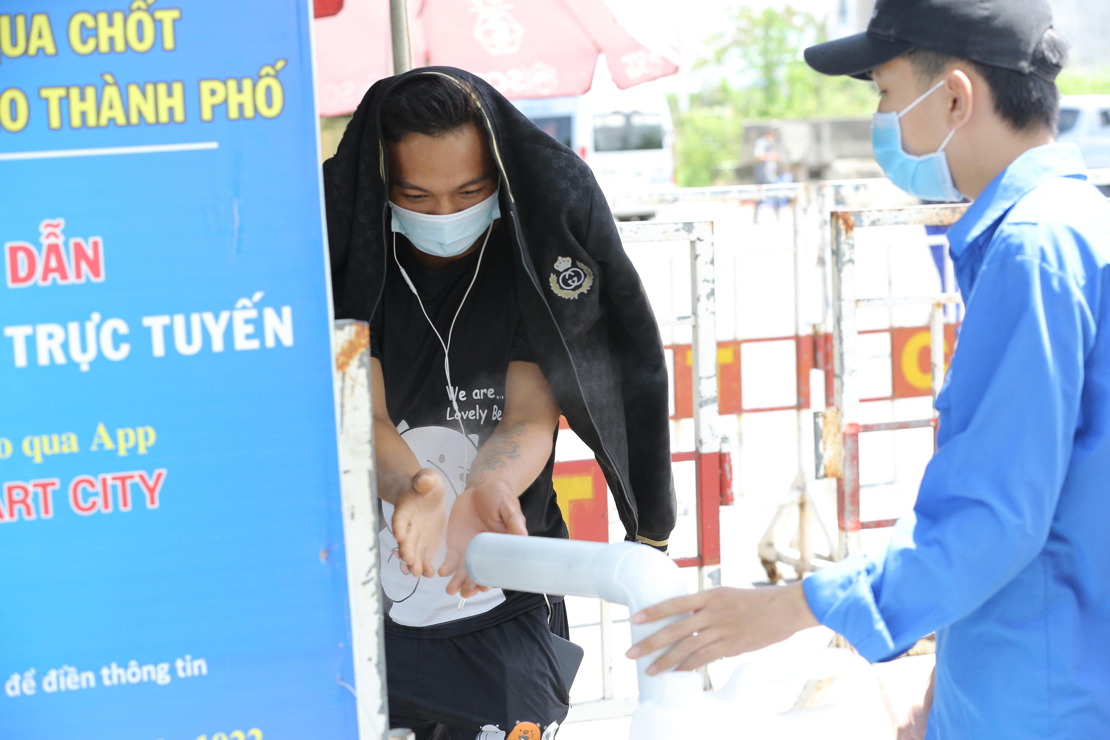 Mọi người được sát khuẩn toàn thân trước khi vào khu vực quét mã khai báo y tế.