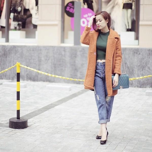 Hay trẻ trung với áo len crop top xanh lá và jean lửng rách gối xắn gấu.
