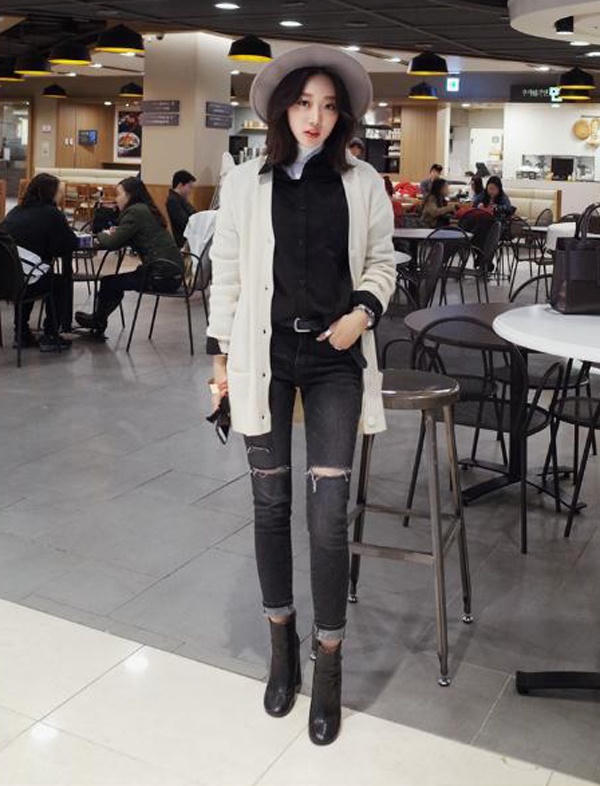 Sành điệu với áo len bó sát màu đen sơ vin quần jeans cạp cao xám rách cá tính. Chiếc thắt lưng thiết kế đơn giản tạo điểm nhấn cho set đồ xuống phố.