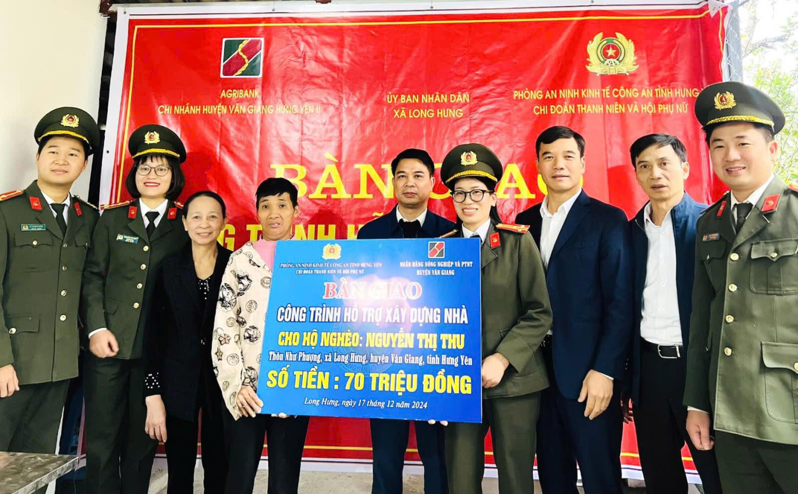Đồng thời, trong năm 2024, Phòng an ninh kinh tế - Công an tỉnh Hưng Yên hưởng ứng phong trào chung tay xóa nhà tạm, nhà dột nát do Thủ tướng Chính phủ phát động năm 2024: phối hợp xây dựng, trao tặng một căn nhà với số tiền 70 triệu đồng cho hộ nghèo là chị Nguyễn Thị Thu bị khuyết tật, đơn thân tại thôn Như Phượng Hạ, xã Long Hưng, huyện Văn Giang; thăm, tặng quà mẹ Việt Nam anh hùng, gia đình chính sách, học sinh khuyết tật,... với tổng trị giá trên 100 triệu đồng.