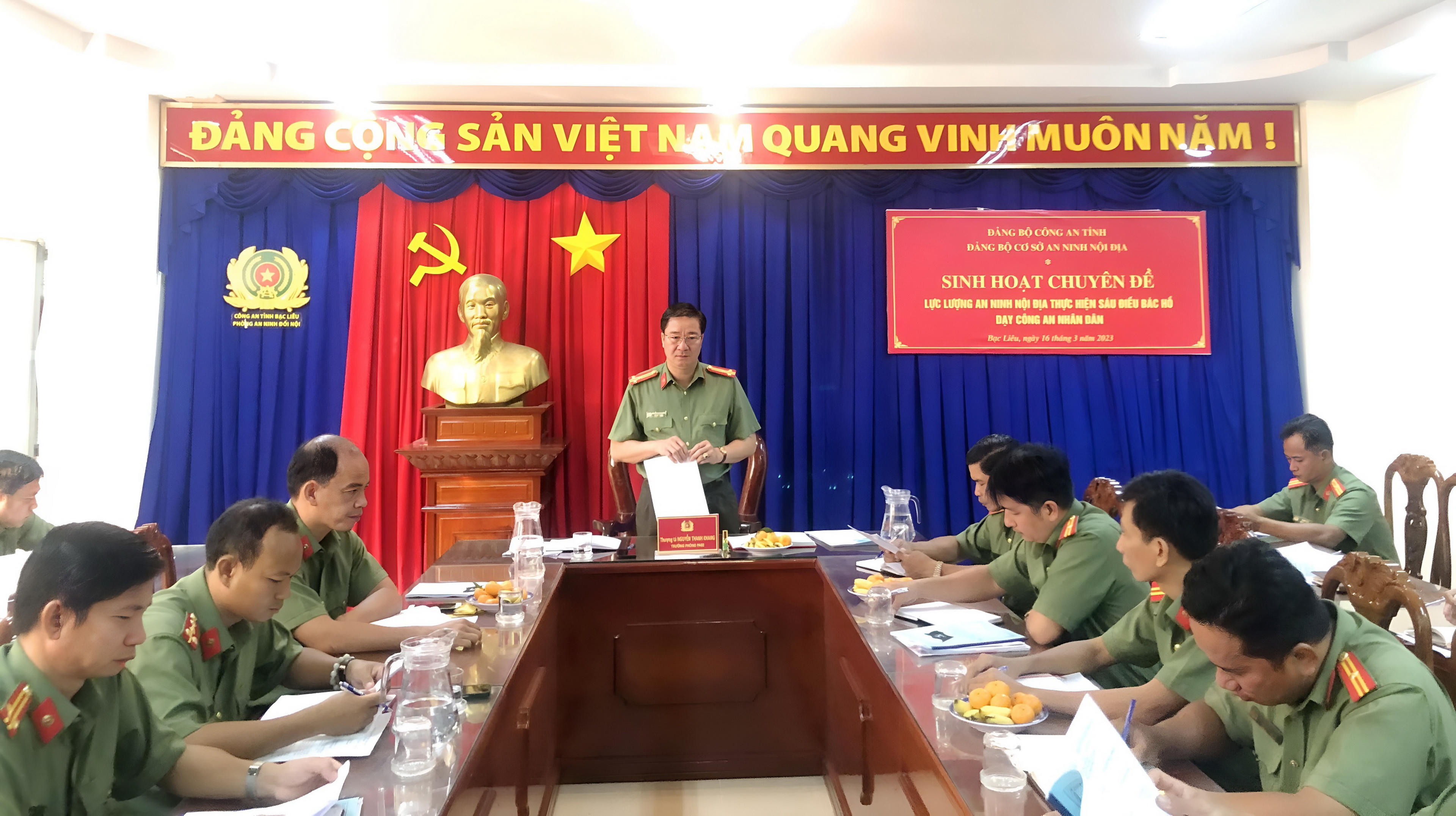 Thượng tá Nguyễn Thanh Khang - Trưởng Phòng An ninh nội địa Công an tỉnh Bạc Liêu triển khai sinh hoạt Chuyên đề lực lượng an ninh nội địa thực hiện Sáu điều Bác Hồ dạy Công an nhân dân. |