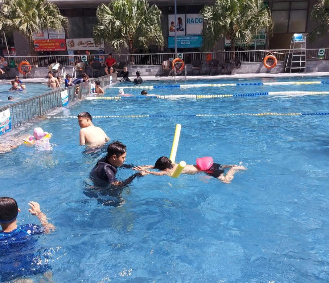 | Một lớp dạy học bơi cho trẻ em tại huyện Thanh Trì, Hà Nội. |