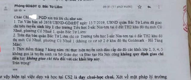 Theo một số phụ huynh có con học tại trường Liên cấp Newton 136 Hồ Tùng Mậu thì phòng GD&ĐT quận Bắc Từ Liêm cho biết, tại văn bản số 2658/UBND-GD&ĐT ngày 15/7/2019, UBND quận Bắc Từ Liêm đã giao chỉ tiêu tuyển sinh lớp 1 cho trường Tiểu học I – sắc Niu - tơn tại ô đất TH2 khu đô thị mới Cổ Nhuế, phường Cổ Nhuế 1, quận Bắc Từ Liêm.