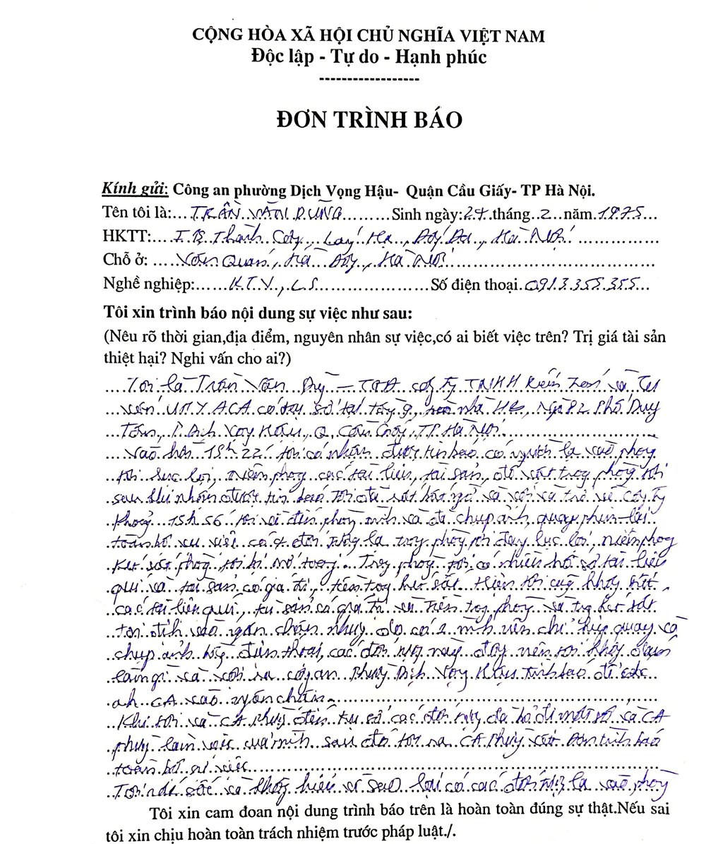 Đơn gửi đến Báo PLVN, ông Trần Văn Dũng, TGĐ Công ty Kiểm toán UHY ACA cho biết: sự việc diễn ra vào chiều ngày 19/7/2016, khi ông đang đi ra ngoài công ty có việc riêng. “Vào lúc 15 giờ 22 phút tôi nhận tin báo có người lạ vào phòng tôi lục lọi các tài liệu, tài sản, đồ vật trong phòng tôi. Sau khi nhận được tin báo tôi đã rất bất ngờ và vội vã về trụ sở công ty”- ông Dũng kể lại.