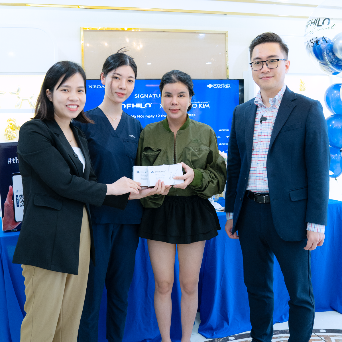 Đại diện NeoAsia và đại diện Cao Kim trao tặng một liệu trình Profhilo cho khách hàng thân thiết