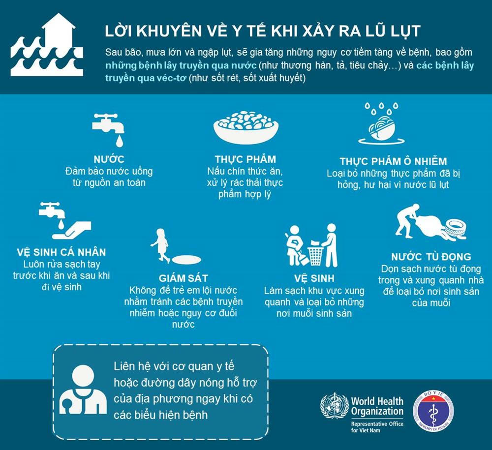 Trong và sau mưa bão, lũ lụt sẽ có rất nhiều vi sinh vật, bụi, rác, chất thải… theo dòng nước tràn ra nhiều nơi, gây ô nhiễm môi trường và tiềm ẩn nhiều nguy cơ dịch bệnh. Hơn nữa, mưa và ngập lụt là điều kiện thuận lợi để các loại vi khuẩn, vi rút và trung gian truyền bệnh sinh sôi phát triển và gây bệnh cho con người.