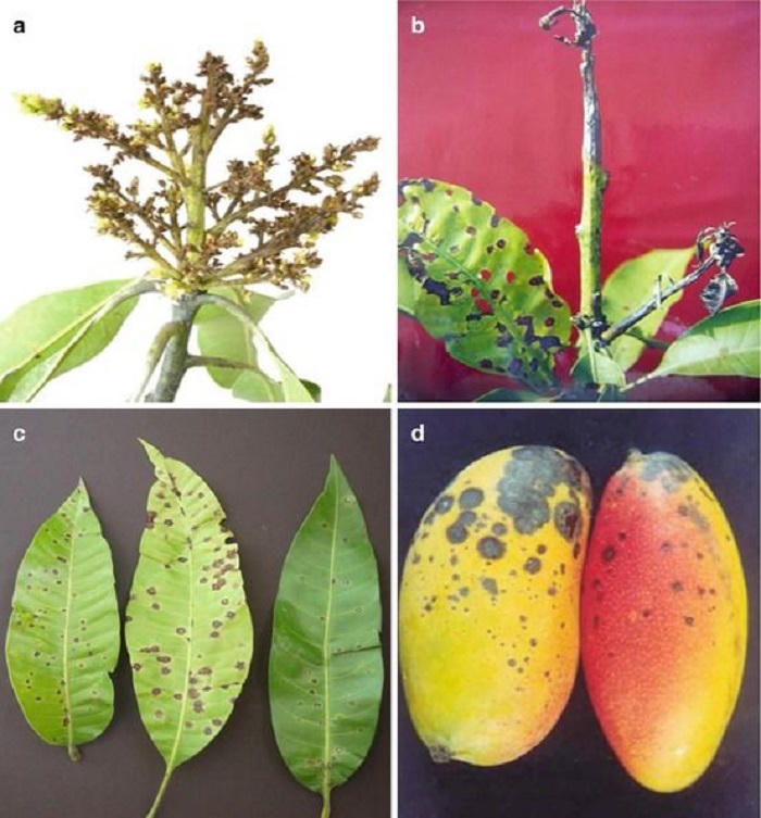 Khi thán thư tấn công hoa xoài, trên hoa sẽ có những đốm đen nhỏ, đặc biệt là lúc trời ẩm nhiều sương mù và mưa sẽ khiến hoa bị khô đen và rụng đi.