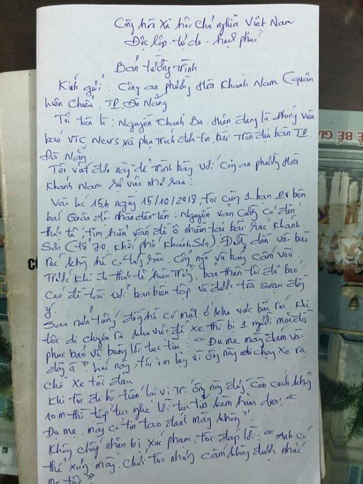 (PLO) - Tối 15/10, đại diện Công an phường Hòa Khánh Nam, quận Liên Chiểu, TP.Đà Nẵng cho biết, vừa làm việc với 2 phóng viên Nguyễn Thanh Ba, báo VTC News và Nguyễn Văn Cường, báo Quân đội Nhân dân (đều đóng tên địa bàn TP. Đà Nẵng), về việc bị đe dọa khi đến làm việc tại bãi rác Khánh Sơn (phường Hòa Khánh Nam, quận Liên Chiểu).