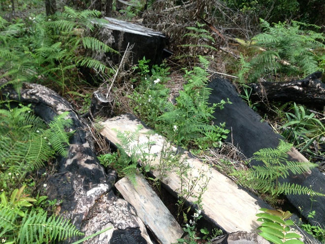 Đi sâu vào lõi khu bảo tồn khoảng gần 2km nữa những khung cảnh mà chúng tôi bắt gặp vẫn không có gì thay đổi. Vẫn là những thân cây đại thụ bị cưa đổ còn trơ gốc, những cành lá bị đốt cháy dở còn sót lại. Đến đây thì T nói chỉ còn khoảng gần 1 giờ đi bộ nữa là sẽ lên đến đỉnh của Chư Yang Sin, thế nhưng chắc tình hình vẫn thế này thôi, chẳng kiếm đâu ra cây to nữa đâu, chúng (tức lâm tặc) đốn sạch rồi.