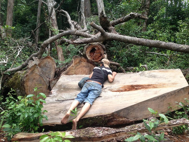 Đến khoảng 2h chiều (tức sau khoảng 9 tiếng đi bộ) chúng tôi đã đến được khu vực mà T và M thông báo là có lâm tặc đang khai thác gỗ trái phép. Nếu dọc đường đi chúng tôi bắt gặp rất nhiều những thân cây bị cưa, những khúc gỗ bị bỏ lại từ lâu thì tại đây có thể phát hiện rất nhiều gốc cây bị cưa mới, thân còn chảy nhựa, lá vẫn còn xanh.