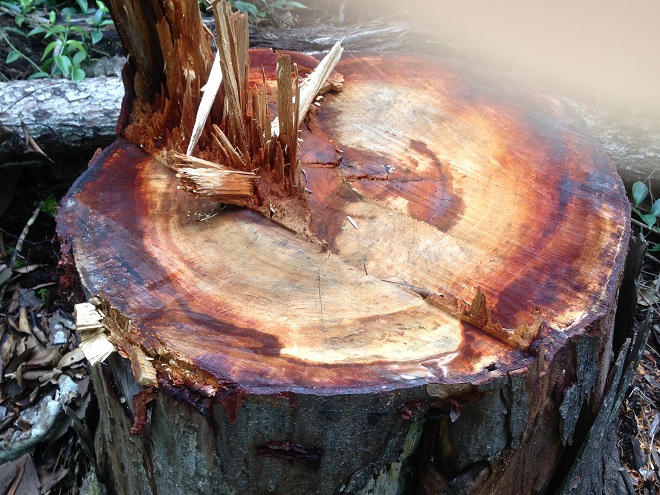Quanh khu vực mà T và M dẫn chúng tôi tới dễ dàng phát hiện hơn 10 bãi gỗ vừa mới bị lâm tặc khai thác trong thời gian gần đây. Theo M cho biết thì đa phần số gỗ bị khai thác là gỗ thông đỏ, một loại gỗ quí, có giá trị rất cao ngoài thị trường. Loại gỗ này mà làm sập, hoặc tượng để trong nhà không chỉ có mùi thơm mà còn có thể đuổi được ruồi, muỗi và nhiều loại côn trùng khác vì vậy mà nó được nhiều đại gia ưa chuộng.