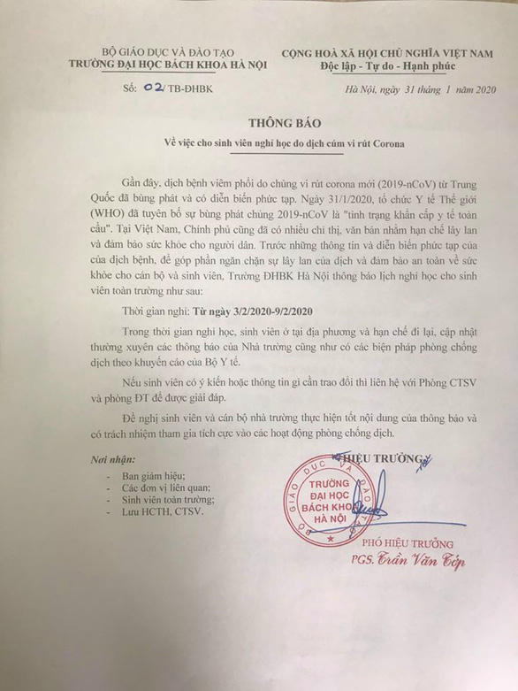 Ban Giám hiệu các trường ĐH Bách khoa Hà Nội, ĐH Xây dựng, Học viện Báo chí & Tuyên truyền... quyết định cho sinh viên tiếp tục nghỉ học thêm một tuần để phòng tránh dịch bệnh do chủng mới virus corona gây ra.