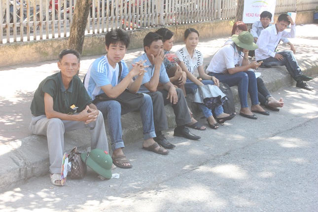 Vì thời tiết nắng nóng nên hầu hết các phụ huynh đứng dưới các tán cây để “tránh nắng đợi con”. Chị Lê Thị Tám, phụ huynh em Lê Thị Linh chai sẻ “hai mẹ con từ Nghĩa Đàn xuống đây thi, may có gia đình mấy anh chị cho chỗ ở nhà miễn phí, sáng nay dậy sớm đưa con đi thi ngồi đây đợi con gái ra luôn. Năm nay cháu muốn thi trường Y nhưng không biết kết quả răng, mong cháu bình tĩnh làm bài tốt…”.