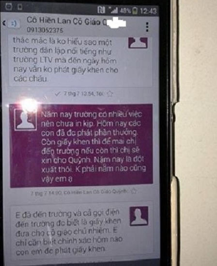 Tin nhắn trao đổi qua lại giữa phụ huynh và cô giáo chủ nhiệm, liên quan đến vấn đề trường Lương Thế Vinh “hết giấy khen”. |
