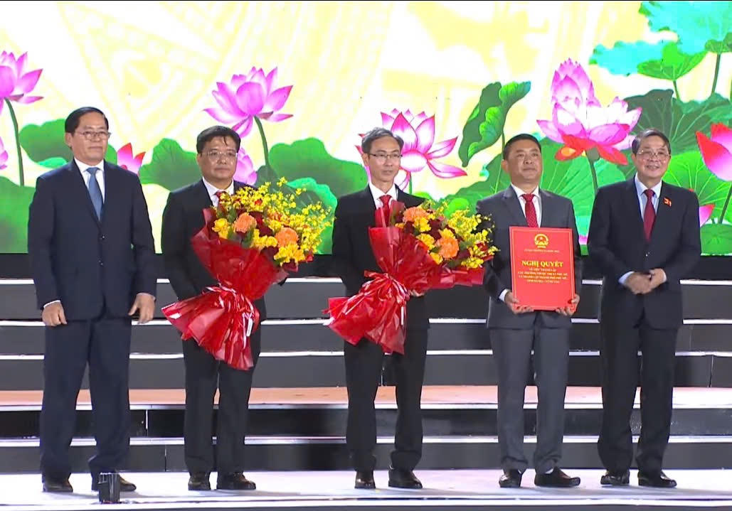 Phó Chủ tịch Quốc hội Nguyễn Đức Hải trao Nghị quyết của Ủy ban Thường vụ Quốc hội về việc thành lập các phường thuộc thị xã Phú Mỹ và thành lập thành phố Phú Mỹ cho đại diện lãnh đạo địa phương. |