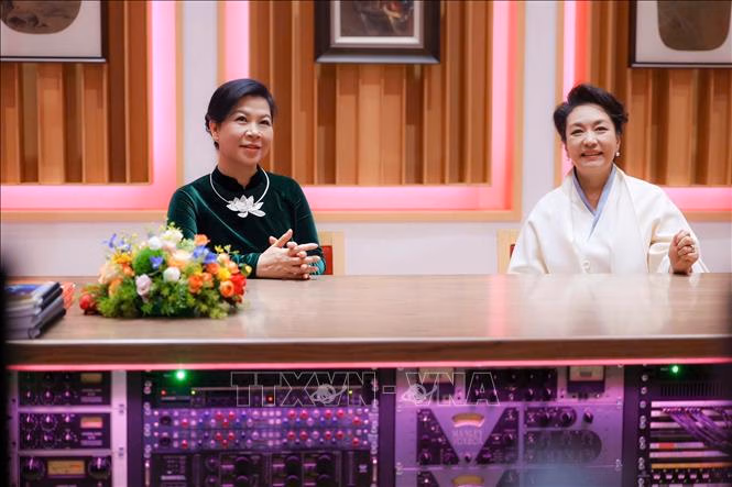 Hai phu nhân đã cùng nhau xem tổng duyệt một vở nhạc kịch, tham quan không gian dịch vụ tự động phục vụ bằng robot, trải nghiệm công nghệ dàn dựng sân khấu ảo và phòng thu âm kỹ thuật cao; đồng thời có cuộc giao lưu, chia sẻ thân tình, cởi mở về các trải nghiệm thực tế cũng như việc giao lưu, phát triển văn hóa giữa hai nước.