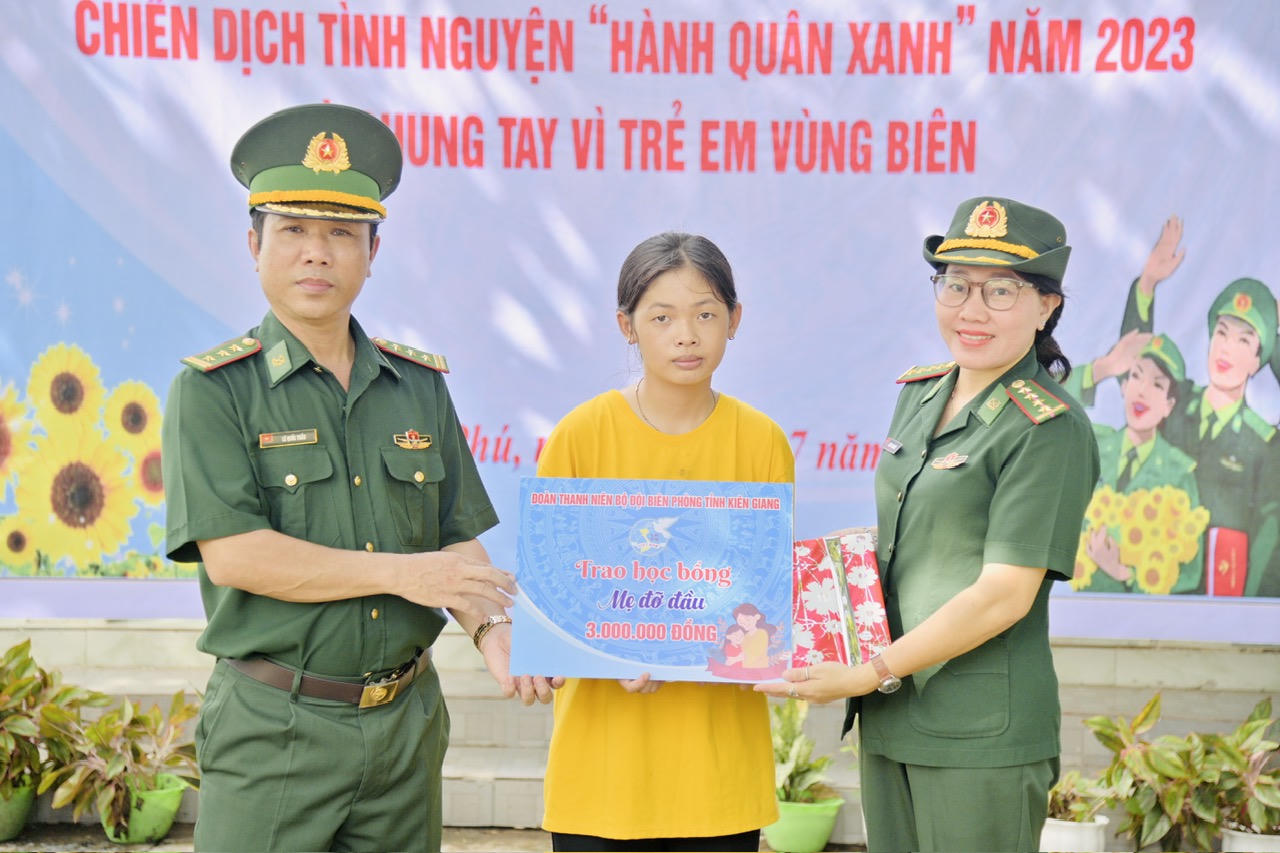 Đại uý Lâm Thị Thu Ngân cho biết thêm, năm 2023, Hội đã xây dựng và thực hiện được mô hình mới: mô hình “Quyển vở yêu thương” tiếp bước em tới trường. Vận động nguồn kinh phí từ các mạnh thường quân đã trao tặng 220 suất quà gồm 20 bộ sách, 40 bộ quần áo mới, 2.000 quyển tập, 200 cái cặp, 100 bình nước cho các em học sinh có hoàn cảnh khó khăn vùng biên giới xã Phú Lợi, huyện Giang Thành và phường Đông Hồ, Thành phố Hà Tiên với tổng trị giá 40 triệu đồng.