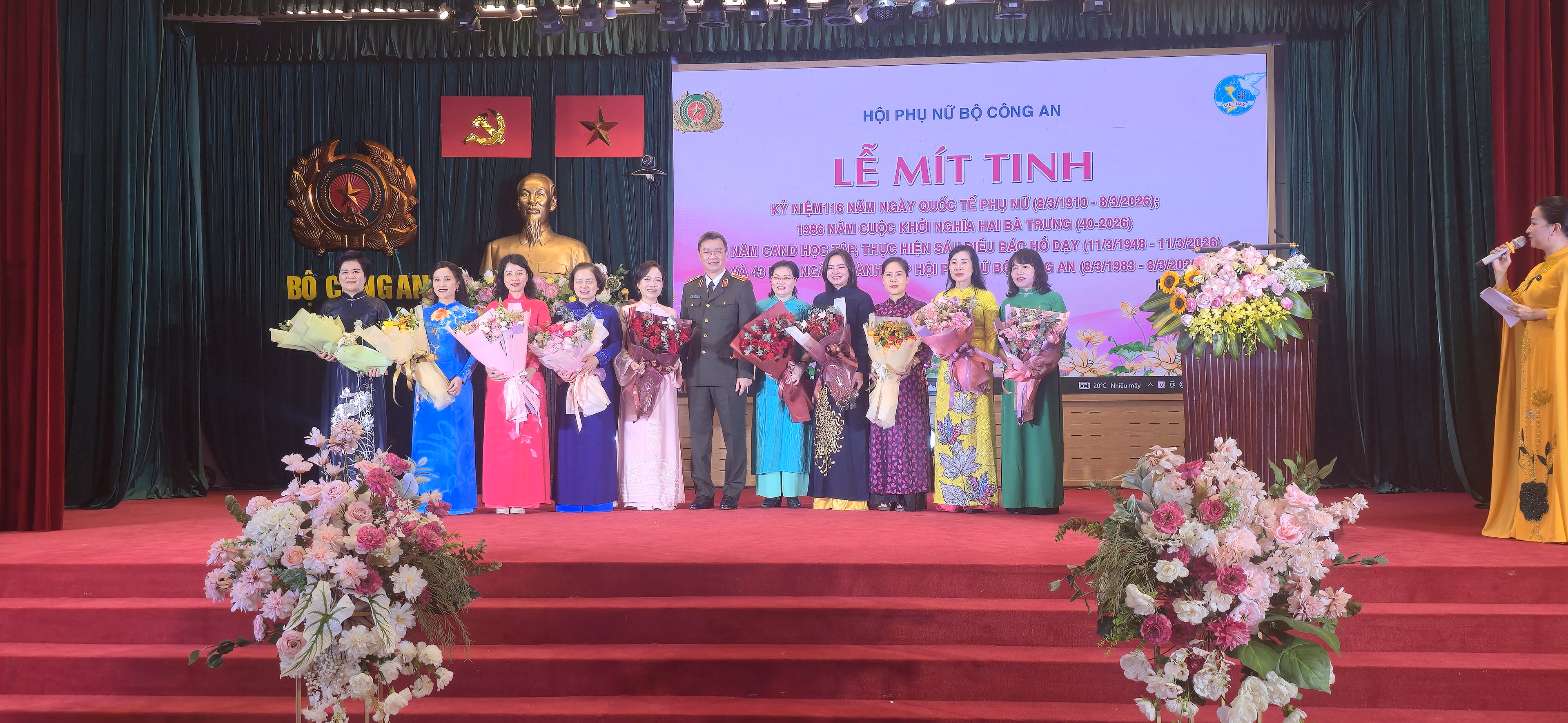 Chiều ngày 06/3/2026, tại Hà Nội, Hội phụ nữ Bộ Công an đã tổ chức Lễ mít tinh kỷ niệm 116 năm Ngày Quốc tế Phụ nữ (8/3/1910 – 8/3/2026), 1986 năm Cuộc khởi nghĩa Hai Bà Trưng, 78 năm Công an nhân dân học tập, thực hiện Sáu điều Bác Hồ dạy (11/3/1948 – 11/3/2026) và 43 năm Ngày thành lập Hội Phụ nữ Bộ Công an (8/3/1983 – 8/3/2026),