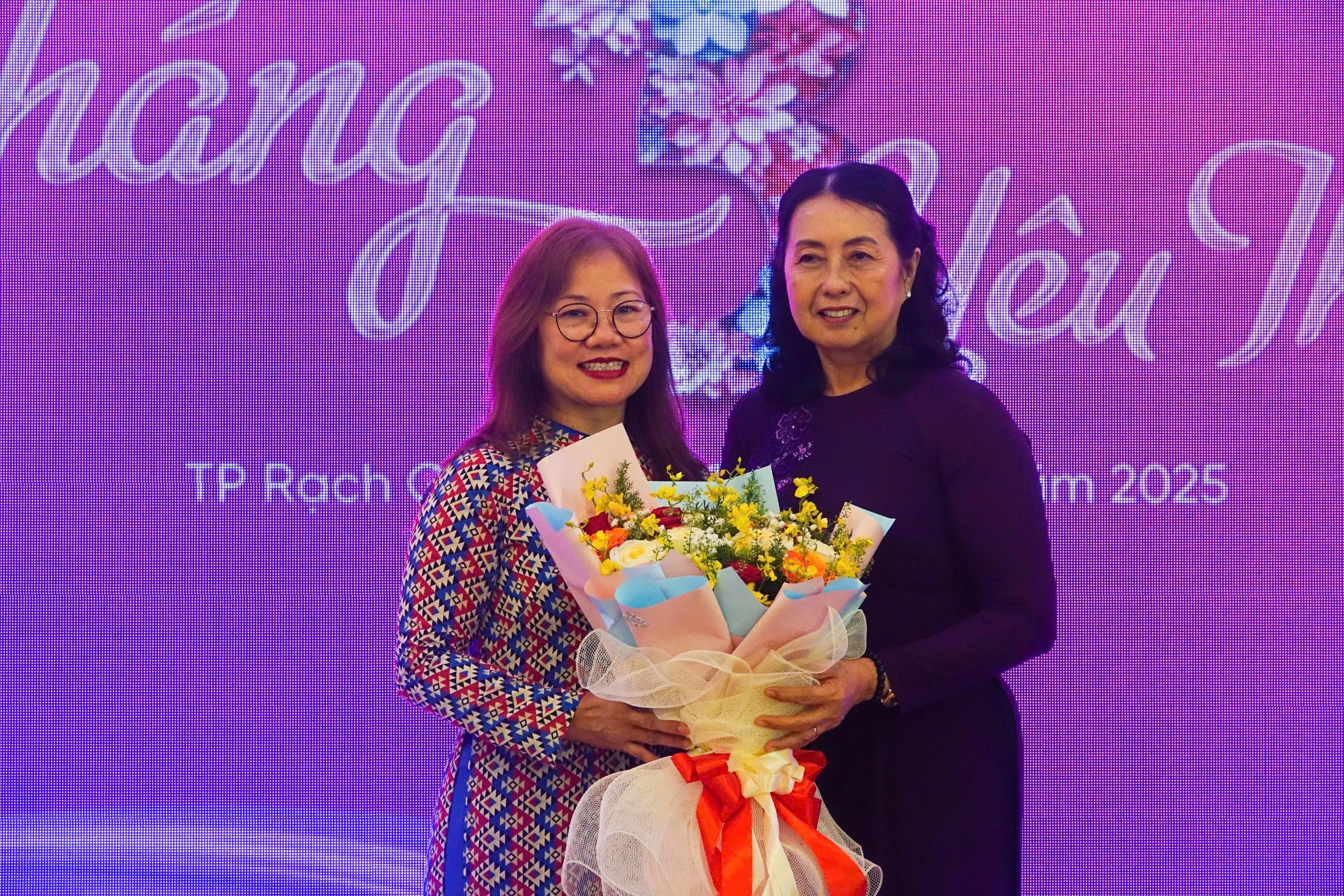 Bà Hồ Kim Liên - Chủ tịch Hội Nữ doanh nhân Kiên Giang trao hoa cho diễn giả Jean Tran ở Úc - Ảnh: Khánh Thùy |