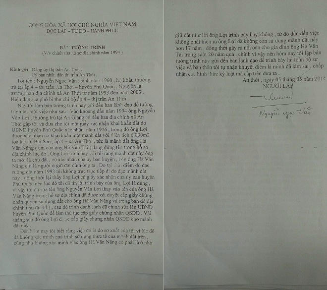 Việc chỉnh sửa hồ sơ này chính ông Nguyễn Ngọc Văn nguyên là Trưởng ban địa chính xã An Thới năm đó, nay là Bí thư chi bộ Khu phố 4 – thị trấn An Thới xác nhận trong bản tường trình gửi cho Đảng ủy và UBND thị trấn An Thới: