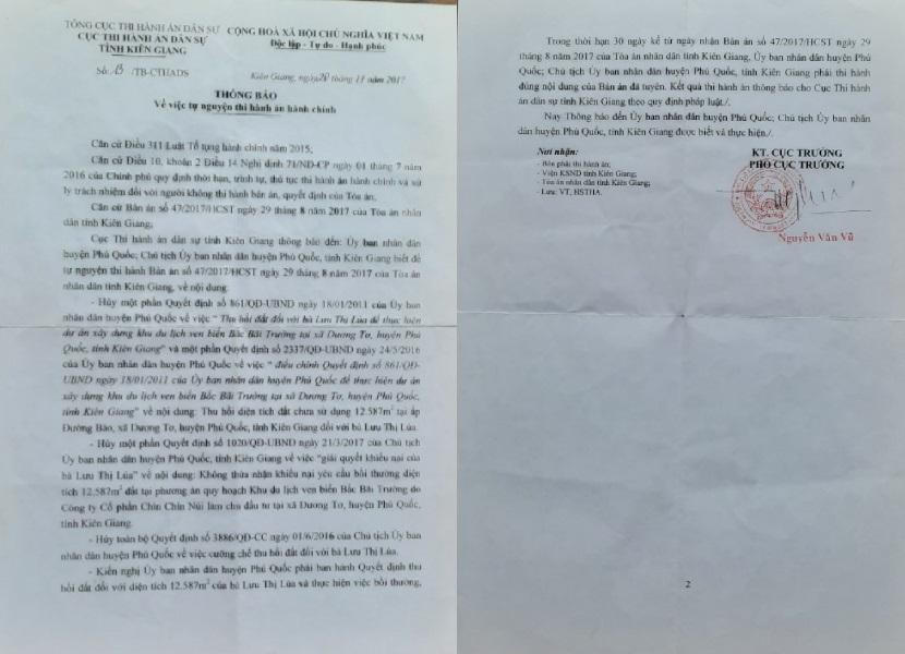 Thông báo của Cục THADS tỉnh Kiên Giang về việc UBND huyện Phú Quốc phải thi hành bản án hành chính đã có hiệu lực. |