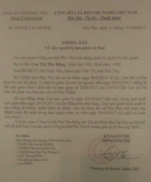 Theo thông tin từ phía gia đình ông Sự, ngày 31/10/2017, Trại tạm giam Công an tỉnh Phú Thọ đã có Thông báo số 929/TB-CAT-PC81B thông báo về việc người bị tạm giam có thai, với nội dung: Cao Thị Thu Hằng bị TAND tỉnh Phú Thọ xét xử sơ thẩm ngày 9/6/2016 về tội “Lừa đảo chiếm đoạt tài sản”; án phạt 12 năm tù giam (bị cáo tại ngoại) đến ngày 2/10/2017, Hằng bị bắt tạm giam theo Lệnh bắt và tạm giam số 2026/2017 của TAND cấp cao tại Hà Nội, để phục vụ công tác xét xử.