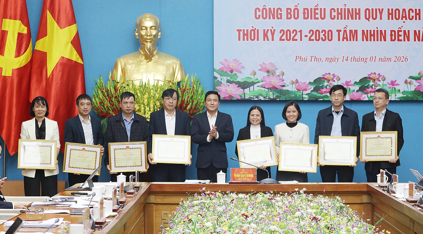 Nhân dịp này, UBND tỉnh Phú Thọ đã trao Bằng khen cho 2 tập thể và 18 cá nhân có thành tích xuất sắc trong công tác lập Điều chỉnh Quy hoạch tỉnh Phú Thọ thời kỳ 2021 - 2030, tầm nhìn đến năm 2050.
