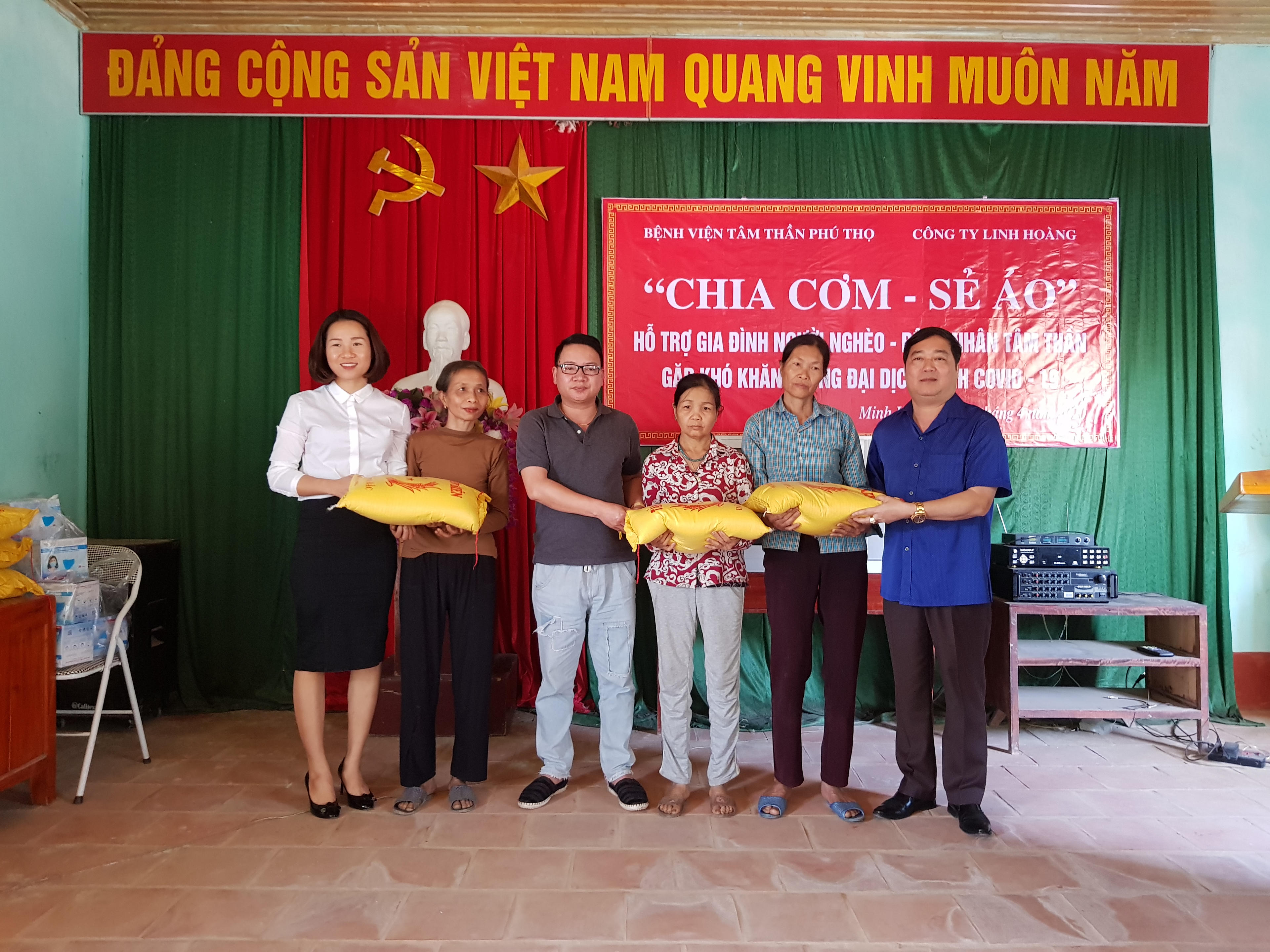(PLVN) - Sáng ngày 28/4, tại UBND xã Minh Hòa, huyện Yên Lập, tỉnh Phú Thọ. Bệnh viện Tâm thần tỉnh Phú Thọ phối hợp với Công ty TNHH Linh Hoàng (trụ sở tại thị xã Phú Thọ) đã trao 2,5 tấn gạo ủng hộ cho những hộ gia đình có người bị bệnh tâm thần và những hộ nghèo trong địa bàn xã, dựa trên chương trình: “Chia cơm, sẻ áo” do Bệnh viện Tâm thần tỉnh Phú Thọ phối hợp cùng các nhà báo phát động trước đó.