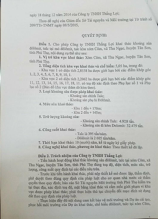 Không tiền, tôi phải đi vay 5 triệu đồng để làm đường, nhưng nay đơn vị khai thác đã làm hỏng hết rồi, người dân có ý kiến lên chính quyền địa phương nhưng không được giải quyết, bất lực, chúng tôi định ra chặn đường thì bị đơn vị khai thác khoáng sản đe dọa nên đành thôi và ôm nỗi bức xúc trong lòng”, bà Săn cho biết thêm. “Đơn vị về địa phương khai thác khoáng sản, không biết có được cấp phép hay không, có đem gì cho người dân nơi đây, nhưng cái thiệt hại thì đã hiển hiện rõ nét. Những con đường bị băm nát, ô nhiễm bụi, ruộng nương bị ảnh hưởng và đời sống của người dân đã bị đảo lộn. Không hiểu lý do gì, hơn 1 năm trước, chúng tôi thấy có cán bộ của huyện Tân Sơn xuống khu mỏ, sau đó, hoạt động khai thác có dừng lại khoảng 1 – 2 tháng rồi lại tiếp tục làm như bình thường”, một người dân ở xã Thu Ngạc cho biết. Doanh nghiệp đe dọa cán bộ tài nguyên huyện? Theo tìm hiểu của PV, năm 2015 UBND tỉnh Phú Thọ kí quyết định số 13/GP-UBND cho phép công ty TNHH Thắng Lợi (gọi tắt là công ty Thắng Lợi) khai thác khoáng sản đôlomit và talc tại mỏ đôlomít , talc tại xóm Côm, xã Thu Ngạc, huyện Tân Sơn, tỉnh Phú Thọ được Phó chủ tịch UBND tỉnh Nguyễn Đình Cúc ký.