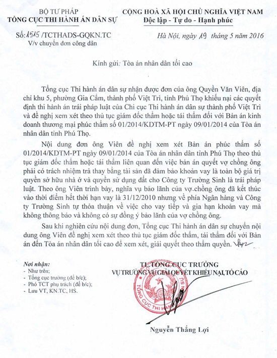 Như vậy, Bản án phúc thẩm số 01/2014/KDTM-ST ngày 09/01/2014 của TAND tỉnh Phú Thọ tuyên buộc gia đình ông Viên có nghĩa vụ trả nợ thay cho Công ty Trường Sinh là trái với quy định của pháp luật. Từ những căn cứ nêu trên, luật sư Dương nêu quan điểm, hợp đồng này có khả năng vô hiệu bởi lẽ: