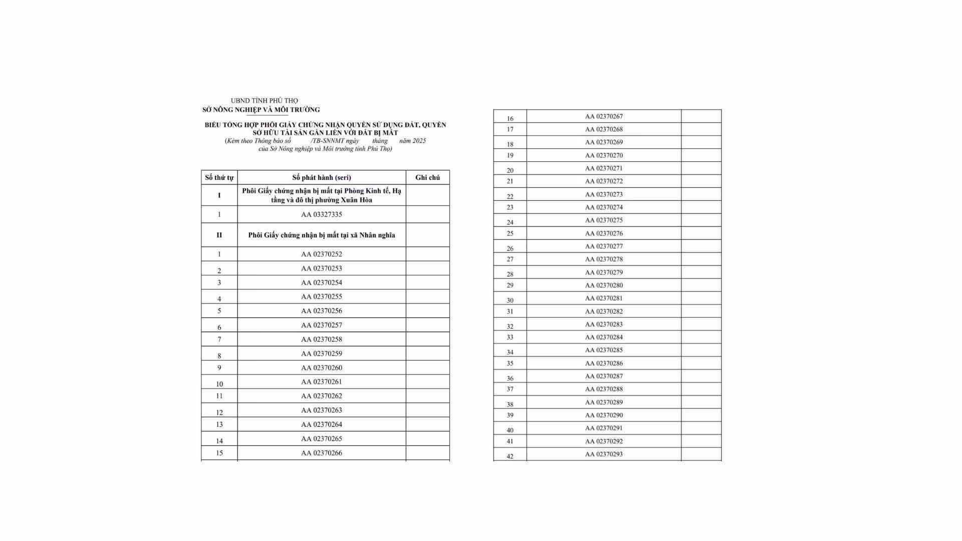 Theo Thông báo số 114/TB-UBND ngày 25/11/2025, việc công bố được thực hiện trên cơ sở Thông báo số 491/TB-SNNMT của Sở Nông nghiệp và Môi trường tỉnh Phú Thọ về tình trạng thất lạc phôi Giấy chứng nhận. Danh sách kèm theo cho thấy tổng cộng 50 phôi có số seri cụ thể đã bị mất, trong đó có một phôi thuộc Phòng Kinh tế - Hạ tầng phường Xuân Hòa và 49 phôi tại xã Nhân Nghĩa.