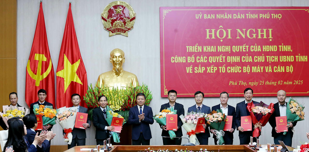 (PLVN) - Chiều 25/2, Ủy ban nhân dân tỉnh Phú Thọ tổ chức hội nghị triển khai các Nghị quyết của Hội đồng nhân dân tỉnh và công bố các quyết định của Chủ tịch Ủy ban nhân tỉnh về sắp xếp tổ chức bộ máy và cán bộ.