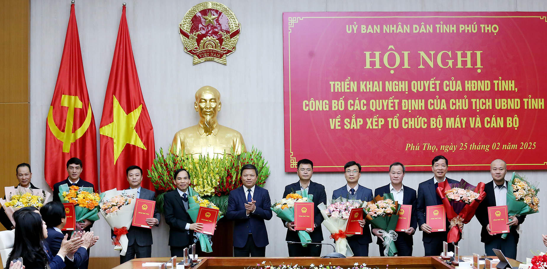 Tại hội nghị, Chủ tịch UBND tỉnh Phú Thọ Bùi Văn Quang đã trao quyết định bổ nhiệm các ông, bà: Vương Thị Bảy, Giám đốc Sở Tài chính; Trịnh Thế Truyền, Giám đốc Sở Nội vụ; Nguyễn Minh Tường, Giám đốc Sở Khoa học và Công nghệ; Nguyễn Minh Tuấn, Giám đốc Sở Nông nghiệp và Môi trường; Trần Quang Tuấn, Giám đốc Sở Xây dựng; Cẩm Hà Chung, Giám đốc Sở Dân tộc và Tôn giáo.