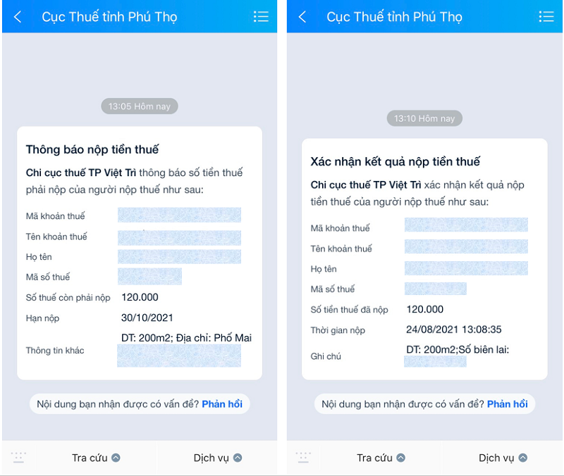 Chị Nguyễn Thị Hà người dân sinh sống tại TP Việt Trì cho biết: Thay vì nhận được biên lai thu tiền như trước đây (trực tiếp tiếp xúc với người giao biên lai), chị sẽ nhận được thông báo nộp thuế, thông báo xác nhận kết quả nộp tiền thuế qua tin nhắn Zalo với đầy đủ các thông tin như: mã khoản thuế, tên tài khoản, tên người nộp thuế, số thuế nộp, thời hạn nộp,... Vì vậy, chị tiết kiệm được nhiều thời gian, chi phí đi lại, việc nộp thuế cũng đơn giản và nhanh chóng hơn, có thể nộp mọi lúc, mọi nơi, dễ dàng tra cứu lại biên lai khi cần.