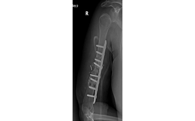 Cách đây 7 năm, sau một tai nạn, chị N.T.L bị gãy xương cánh tay phải, được phẫu thuật kết hợp xương bằng nẹp vít và mang theo phương tiện kết hợp xương kể từ ngày đó.