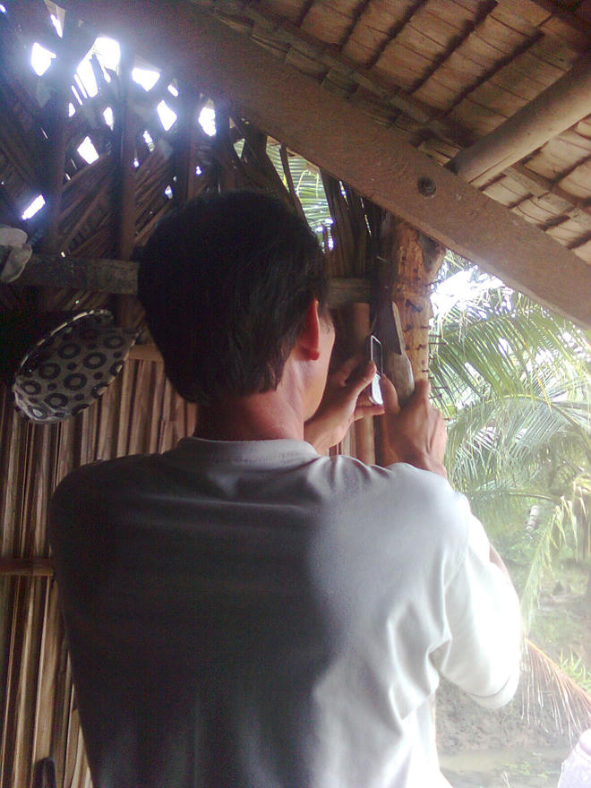 Căn chòi nhỏ lọt thỏm giữa vùng đầm lầy, xung quanh bao quanh bởi cánh đồng lúa, vườn cây mênh mông và những lùm cỏ dại xanh um. Sau gần tiếng đồng hồ lội bì bõm dưới bùn lầy, chúng tôi mới đến được nơi ở của ông Sáu Linh.