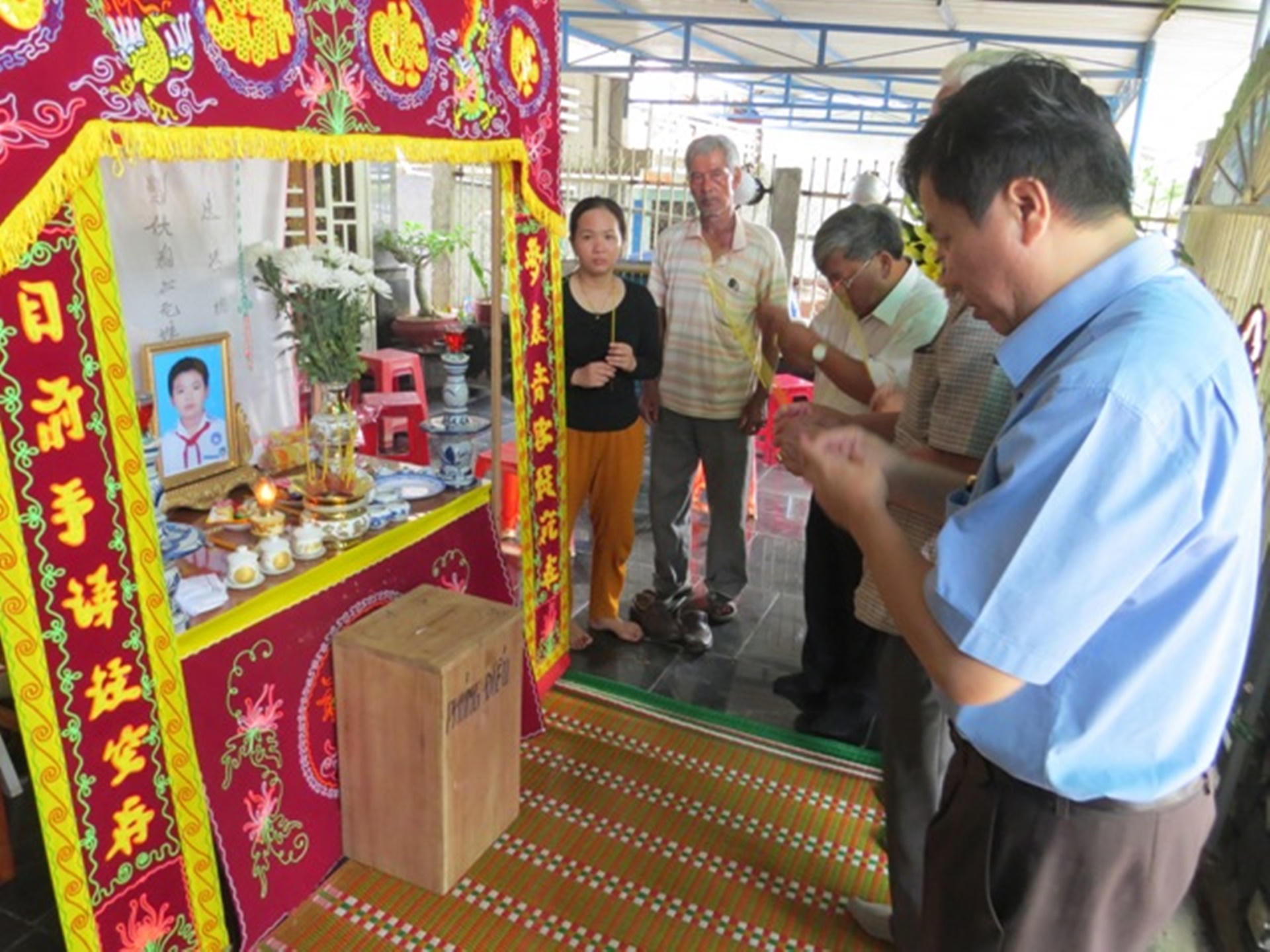 Ngồi thẫn thờ nhìn di ảnh con trai, ông Phạm Xuân Hoàng (45 tuổi, cha em Phạm Xuân Luật) như người mất hồn, mếu máo khóc như trẻ lên 3. “Chưa kịp nhận phần thưởng tổng kết năm học mà con đã vội lìa đời. Con tôi nhỏ dại tội tình gì mà chết oan uổng thế này”, người cha đau khổ, vật vã.