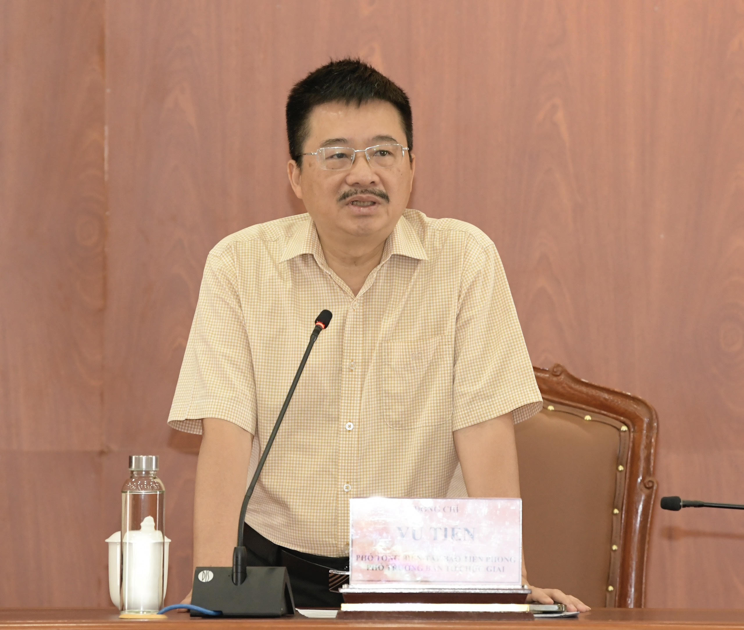 | Nhà báo Vũ Tiến chia sẻ tại buổi họp báo. |