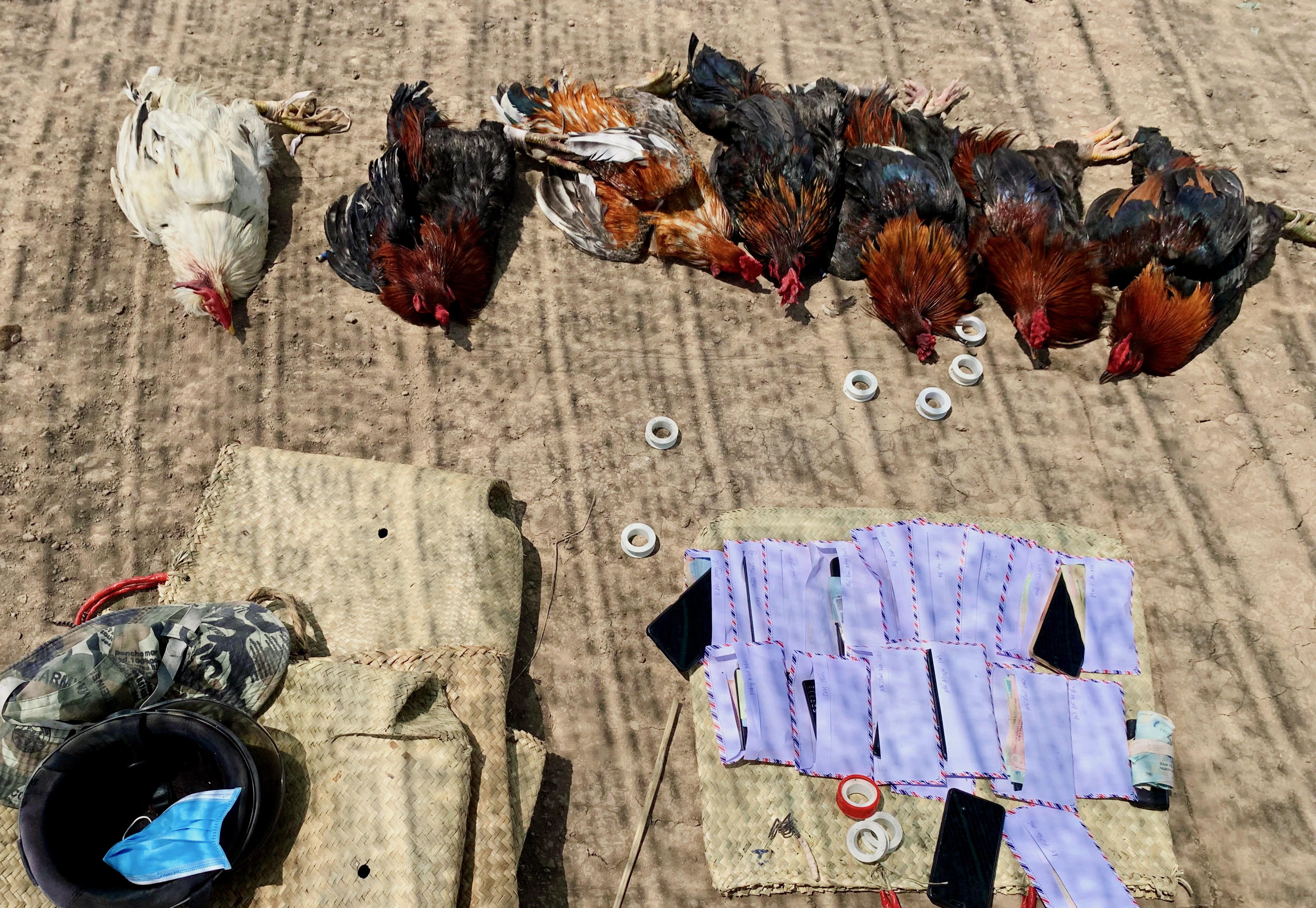 Các đối tượng tham gia đá gà ăn tiền cùng tang vật bị lực lượng Công an bắt quả tang. |