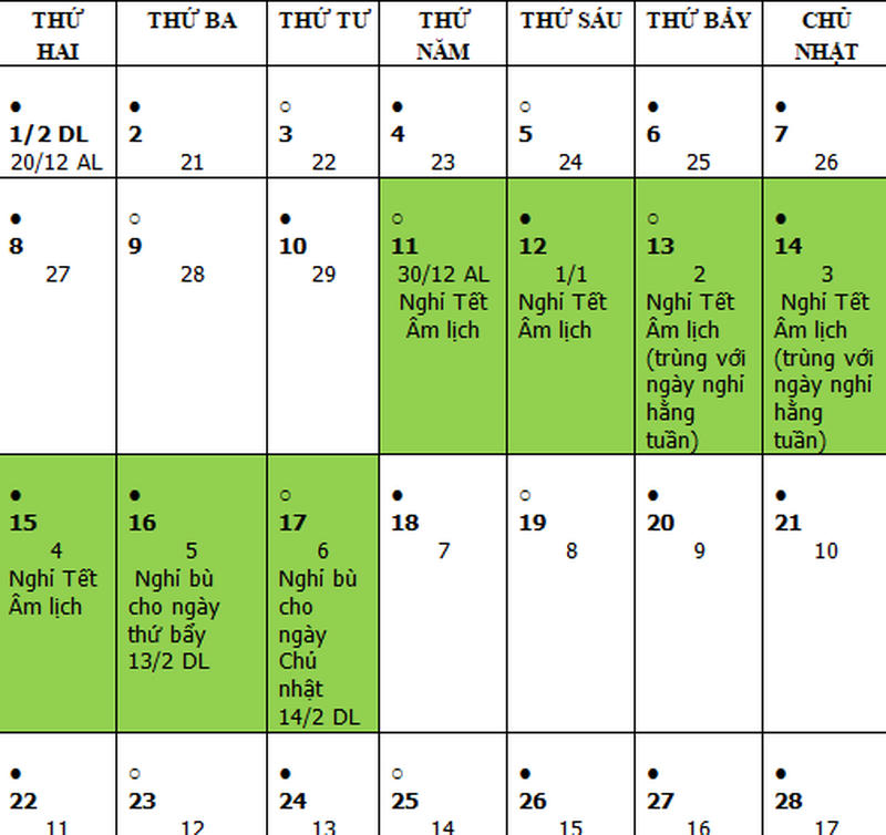 Phương án 2, công chức, viên chức nghỉ Tết Nguyên đán là 7 ngày liên tục. Do ngày mùng 2 và mùng 3 Tết Nguyên đán (tức ngày 13-14 tháng 2/2021 dương lịch) trùng vào thứ Bảy và Chủ nhật là ngày nghỉ hằng tuần, công chức, viên chức sẽ nghỉ bù vào ngày mùng 5 và mùng 6 Tết Nguyên đán (tức ngày 16-17 tháng 2/2021 dương lịch).
