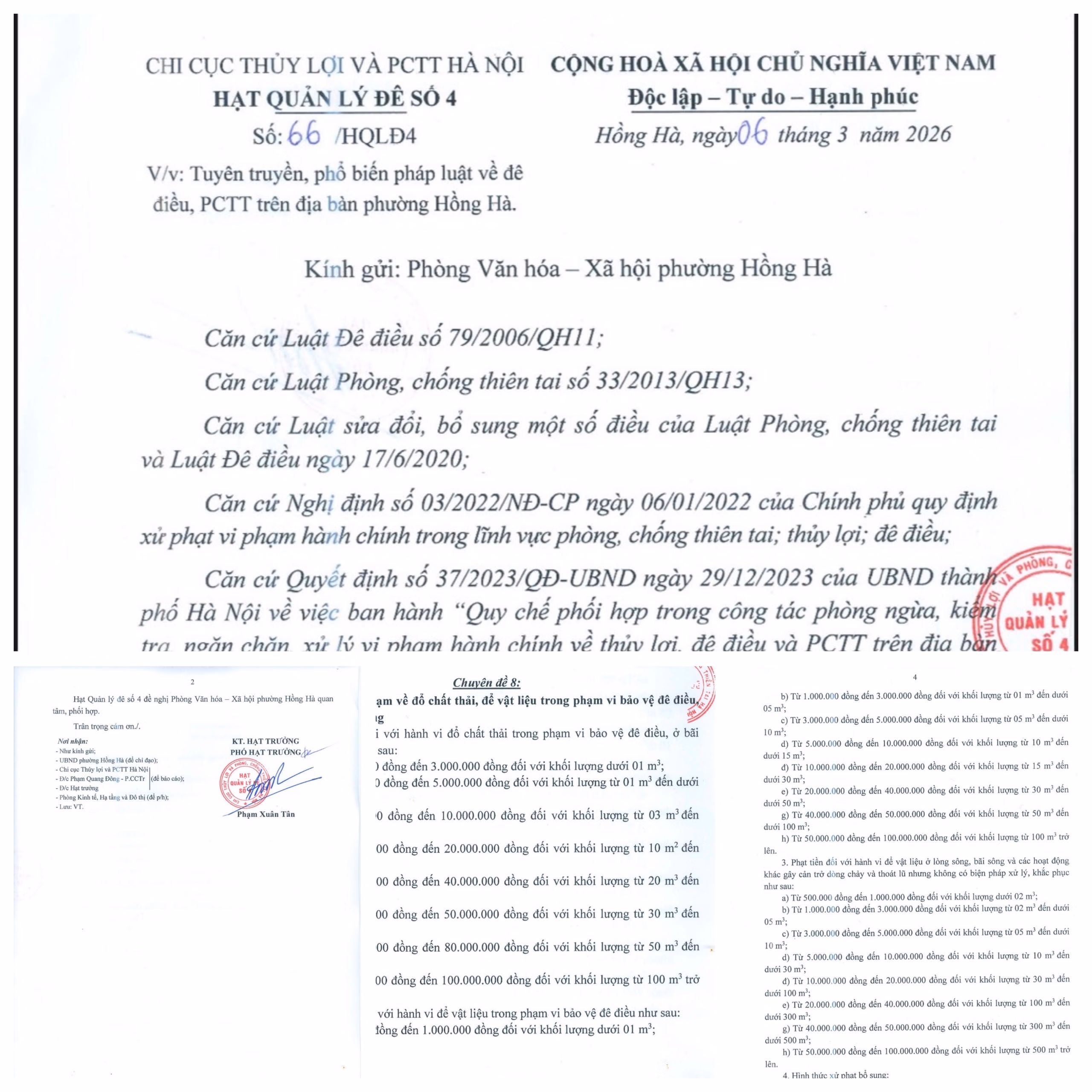 Thực hiện các quy định của pháp luật về công tác quản lý đê điều và phòng, chống thiên tai, Hạt Quản lý đê số 4 - Chi cục Thủy lợi và Phòng, chống thiên tai Hà Nội đã có văn bản số 66/HQLĐĐ4 ngày 06/3/2026 đề nghị UBND phường Hồng Hà tăng cường công tác tuyên truyền, phổ biến pháp luật liên quan đến lĩnh vực này trên địa bàn.